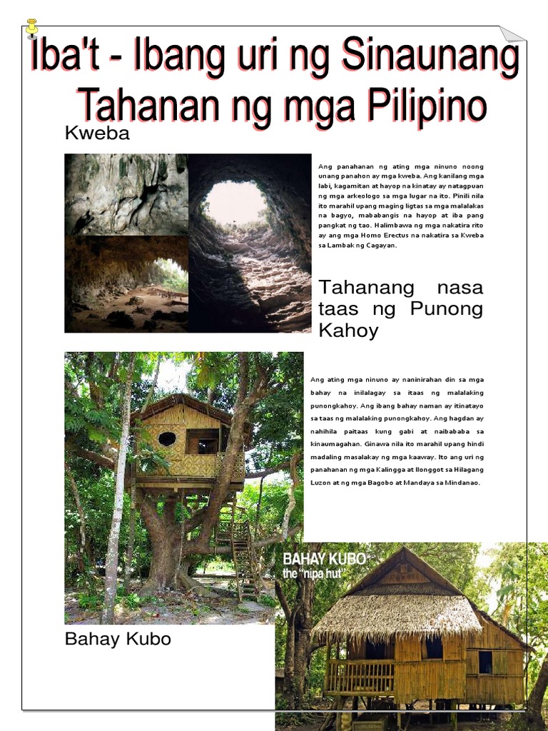Kababaihang Asyano sa Sinaunang Panahon 2. Ang unang bahay ang bahay kubo o nipa hut sa ingles ay ang bahay ng mga Pilipino na nakatira sa mga probinsiya hanggang ngayon. Ang Pilipino noong panahon ng Kastila lalo na sa taong 1898 ay mailalarawan bilang matapang at makabayan.