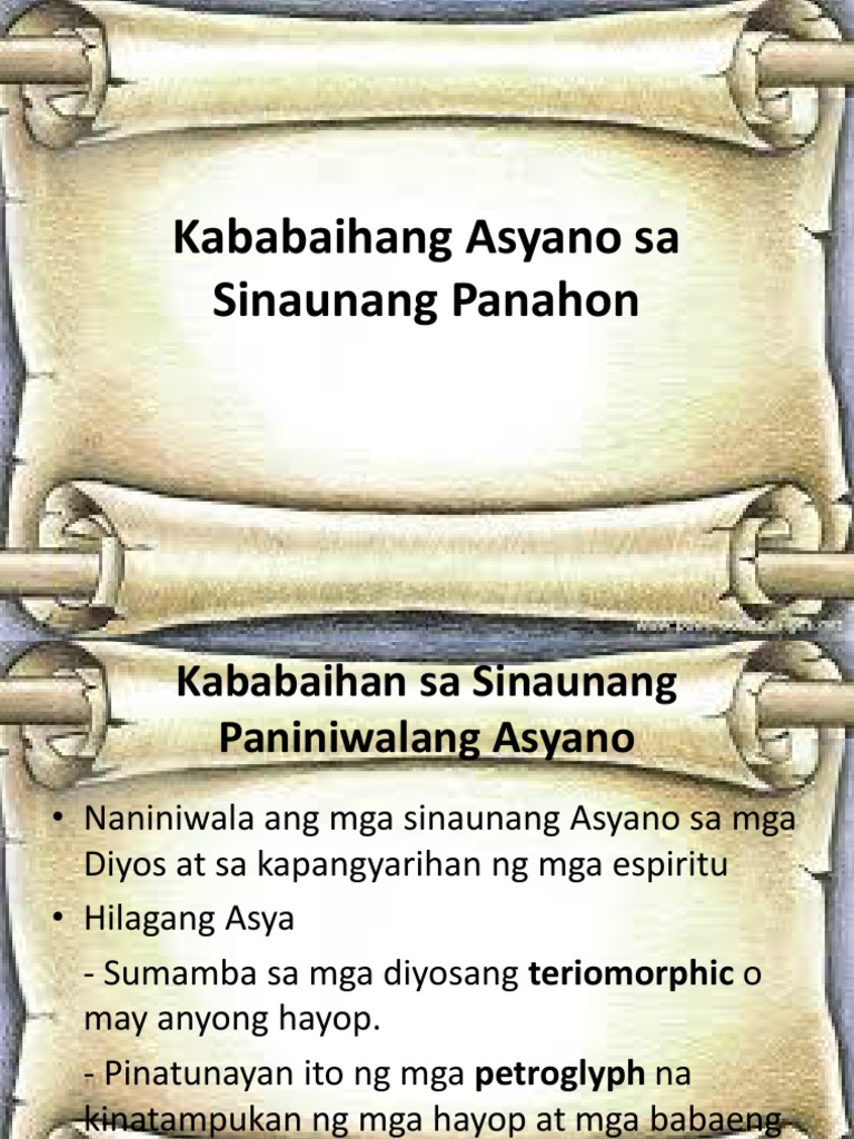 Pag-usbong ng Kabihasnan Grace Estela C. With Super get unlimited access to this resource and over 100000 other Super resources. Kababaihan sa Sinaunang Paniniwalang Asyano Naniniwala ang mga sinaunang Asyano sa mga Diyos at sa kapangyarihan ng mga espiritu Hilagang Asya - Sumamba sa mga diyosang teriomorphic o may anyong hayop.