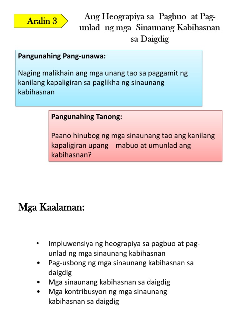 Mga Sinaunang Kabihasnan sa Daigdig Unang Edisyon 2020 Isinasaad sa Batas Republika 8293 Seksiyon 176 na. Mga Aralin at Sakop ng Modyul Aralin 1 Heograpiya ng Daigdig Aralin 2 Ang mga Sinaunang Tao Aralin 3 Ang mga Sinaunang Kabihasnan Sa modyul na ito ay inaasahang matututuhan ang mga sumusunod. Batay sa inyong napanuod alamin kung ano-ano ang mga pamana o ambag ng kabihasnang Tsino at Egyptian at sabihin kung ano ang kahalagahan nito sa atin.